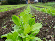 可愛い双葉が、2週間程で随分と野菜らしくなりました。 適度な雨と日光が日々の成長を促進してくれます。 初霜が降りるまで、すくすくと天に向かってまっしぐら! 畝(うね)幅を広く取っているので、間引かなくても横へ 広がっていきます。